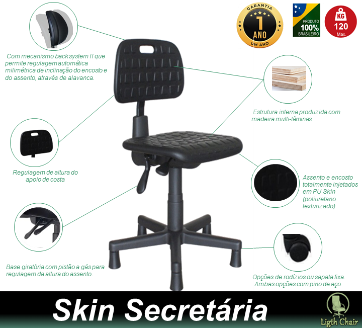 ■ Assento e encosto totalmente injetados em PU Skin (poliuretano texturizado).